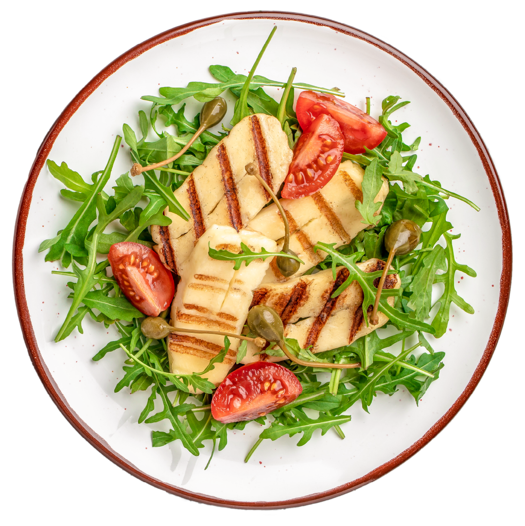 нежные листья салата, помидорки черри, моцарелла Чиледжина с соусом песто и бальзамиком